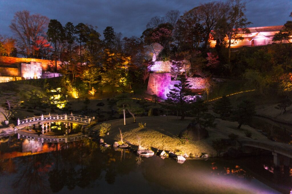这座位于城堡后方的花园是为了纪念金泽第二代藩主的妻子玉泉院而建造的。花园曾被拆除,但后来重建成如今的景象。从很多角度都可以欣赏花园,但我们建议您走进茶室,品尝抹茶,并拍摄一张俯瞰小池塘的照片。