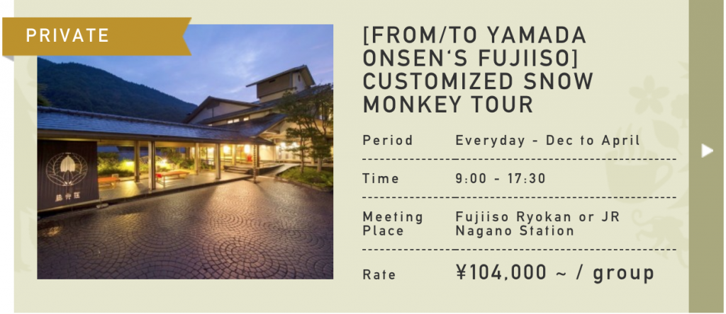 如果您想避开喧嚣的公共交通,Snow Monkey Resorts 为您的团队提供包车和经验丰富的导游的私人旅游。 你可以根据自己的喜好,选择从山田温泉出发到山田温泉结束,或者从长野站出发到山田温泉结束,反之亦然。 查看下面的链接,了解更多的旅游信息。