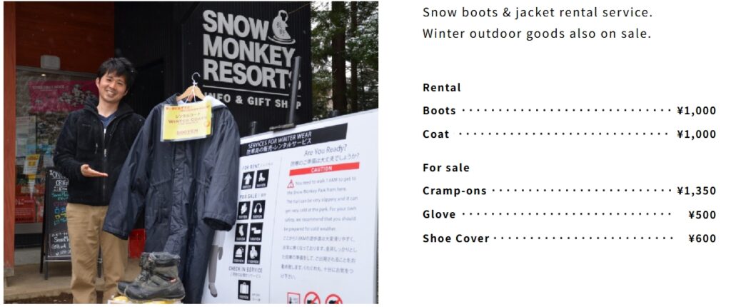 Snow Monkey Resorts 信息及礼品店位于通往地狱谷雪猴公园的步道入口处。SMR 信息及礼品店提供一系列服务,包括冬季租赁、英语信息、行李寄存,以及雪猴周边商品和纪念品,包括 Snow Monkey Resorts 官方产品,让您在游览公园时无后顾之忧。SMR 信息及礼品店每天上午 9 点至下午 5 点开放,会讲英语的工作人员将解答您往返公园途中的疑问,包括公交车时刻表和附近景点的信息。 请注意,公园门票不在此处出售。门票仅在公园入口处出售。