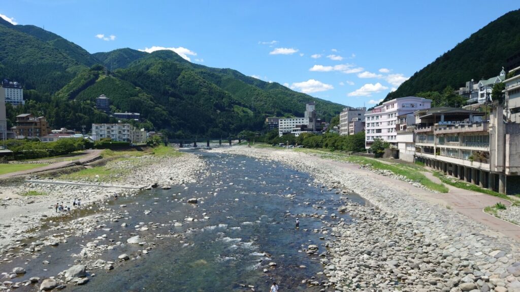 飞騨川流经下吕温泉中心地带,为漫步小镇营造出宁静的氛围。汤之岛大桥是其中最美的景点之一,您可以在那里欣赏群山环绕的河流和小镇的温泉建筑。傍晚的漫步尤其令人心旷神怡,旅馆温暖的灯光倒映在水面上。