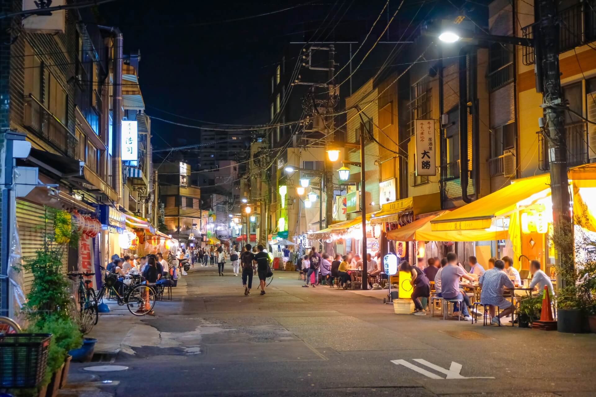 浅草离上野不远,以其天王寺庙群而闻名,是许多国际游客的热门目的地,每天都有成千上万的游客前往那里。在寺庙的西边,浅草的 "Hoppy Dori "或 "Hoppy街 "是一个著名的餐饮区,有许多五颜六色的街头 "居酒屋",提供廉价的美食,并有大量的啤酒、"chuhai酒"、high balls酒和 "hoppy酒 "助兴,气氛热烈。