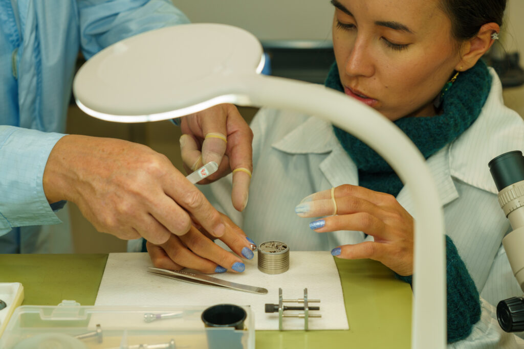 换上工作服后,您将开始使用传统工具和方法组装自己的钟表。无需任何经验。小班授课确保师生比例保持在1:2,从而提供充足的个人指导。这些工匠将全程指导您完成每一个复杂的步骤,从齿轮校准到表盘定位,并分享专业技艺和故事。