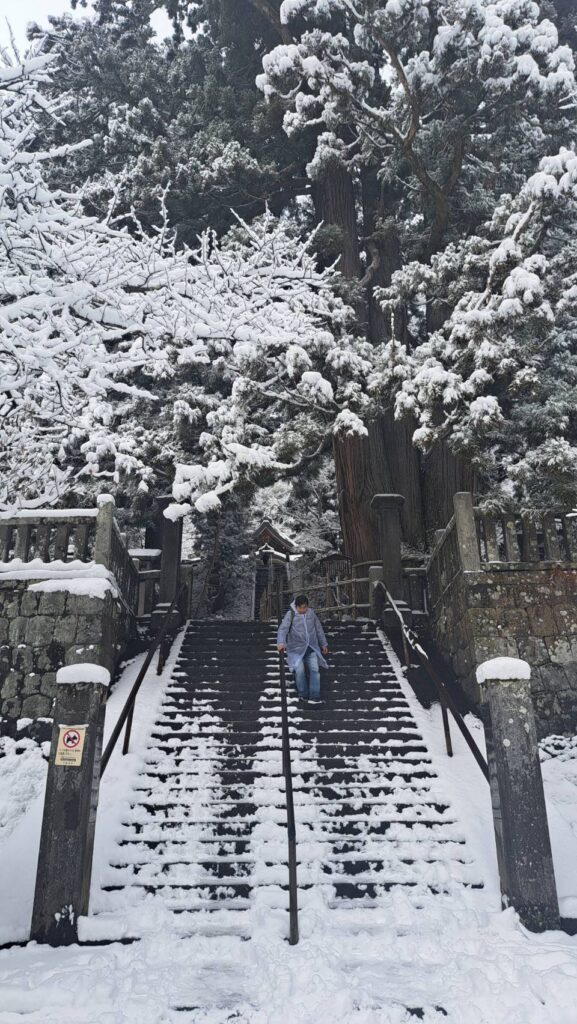 游览结束后,我们将深入森林,沿着标志性的参拜小径前行,小径两旁是参拜者们精心种植的茂密雪松。步行约20分钟即可到达参拜者们的所在地,在非冬季月份,这条小径会一直延伸到奥社神社的深处。虽然我们每年这个时候无法参观这座神社,但白雪皑皑、巍峨的雪松是著名的拍照景点,可以尽情欣赏这些精美的神道教文物。