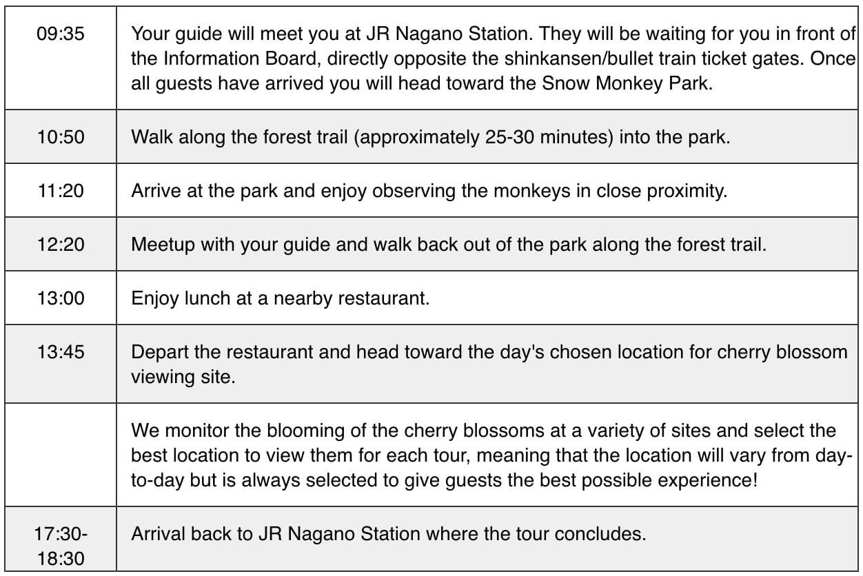 庆祝日本的春天,我们的 "Hello'21!长野春季优惠 "将雪猴公园、樱花和住宿结合在一起。长野春季优惠"! 我们的 "Hello'21!长野春季优惠 "1天雪猴公园和樱花之旅,让您尽情享受长野的春天。以长野站为起点和终点,行程内容包括: