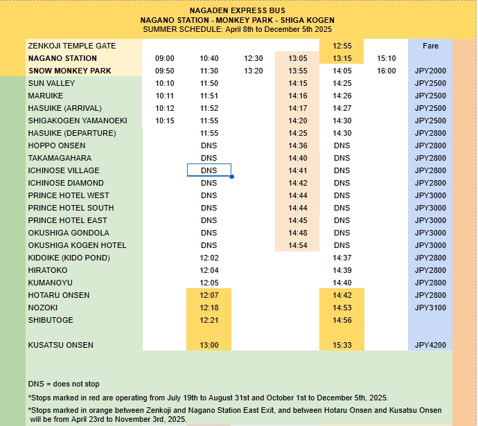 請注意,本頁已剔除長野站至雪猴公園之間所有班次的班次,因為本頁適用於往返志賀高原的旅客。如需查看長野站至雪猴公園之間所有巴士班次的完整列表,請參閱以下頁面: