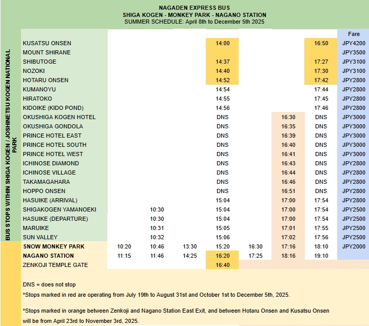 SHIGAKOGEN YAMANOEKI | 08:25 | 10:30 | 13:35 | 14:35 | 15:35 | 16:05 | 17:00 | 18:20 |