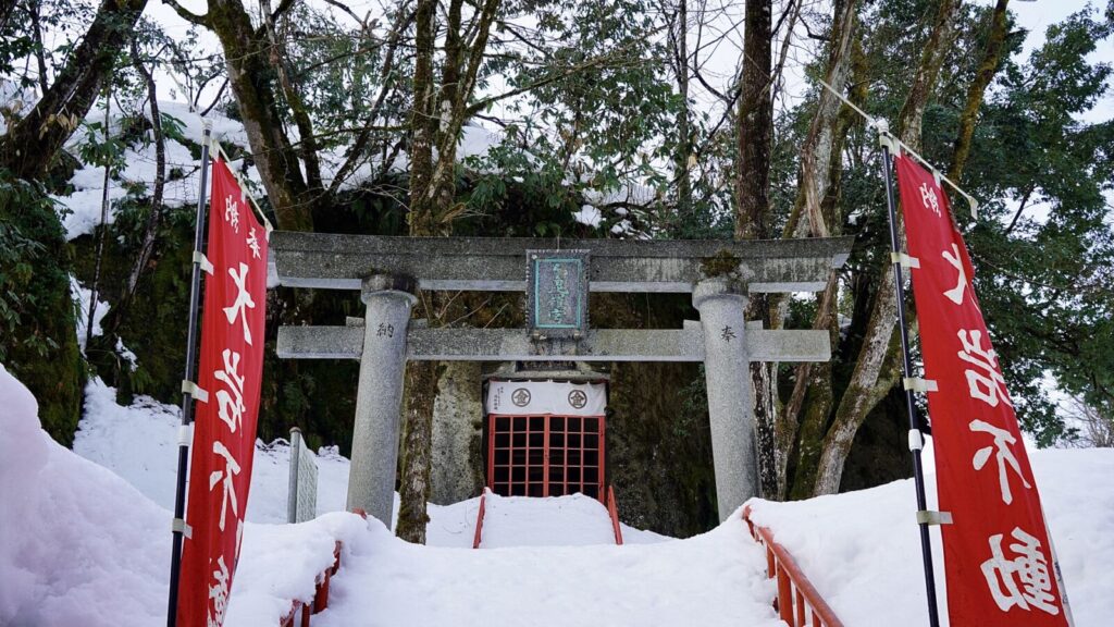 大岩山日石寺以其令人印象深刻的不動明王像而聞名,該像直接雕刻在其主殿內的天然岩壁上,以及苦行瀑布冥想練習。