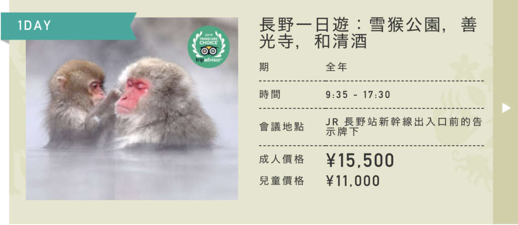 我們最受歡迎的產品是「長野雪猴公園、善光寺和清酒一日遊」。參加這次愉快旅行的客人將首先品嚐清酒,並在導遊的帶領下參觀長野歷史悠久的善光寺,包括在附近的餐廳享用午餐。