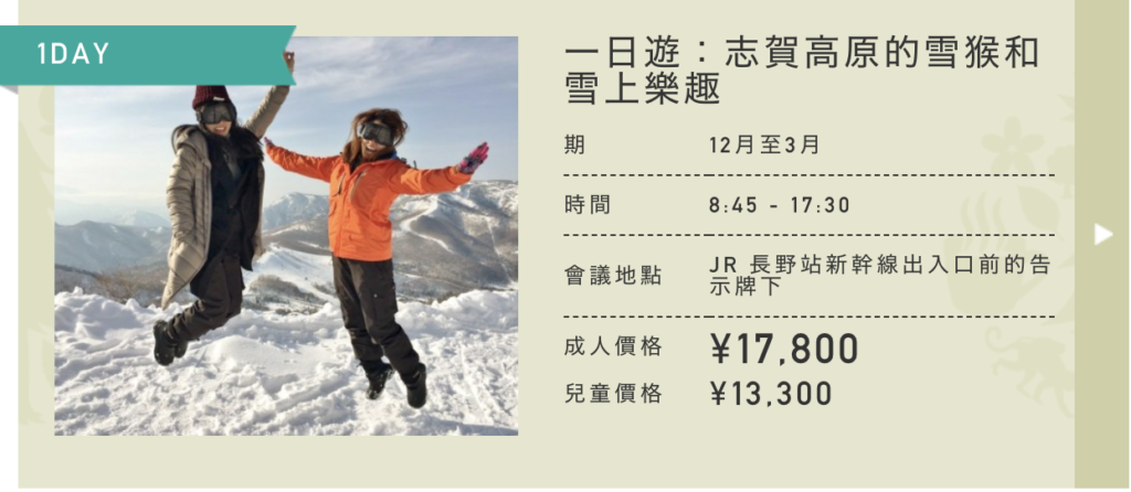 對於冬季前來的客人,我們還提供「志賀高原雪猴與雪上樂趣一日遊」配套,將雪橇、雪地摩托車等刺激的雪上活動與雪猴公園之旅完美結合。套餐包含午餐,是想要體驗長野冬季魅力的遊客的完美一日遊!