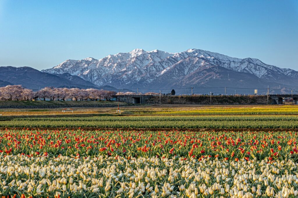 富山縣朝日町的「春之四重奏」是一道獨特的自然奇觀,其主要起源於1957年整修期間在船川沿岸種植的櫻花樹。在隨後的幾年裡,當地農民開始在鄰近的田地特意種植鬱金香和油菜花,並將它們的花期與櫻花同步。這種精心的栽培,加上白雪皚皚的北阿爾卑斯山的映襯,使得這道令人嘆為觀止的視覺盛宴被人們熟知並廣為傳播,被稱為“春之四重奏”,並成為首屈一指的春季攝影勝地。