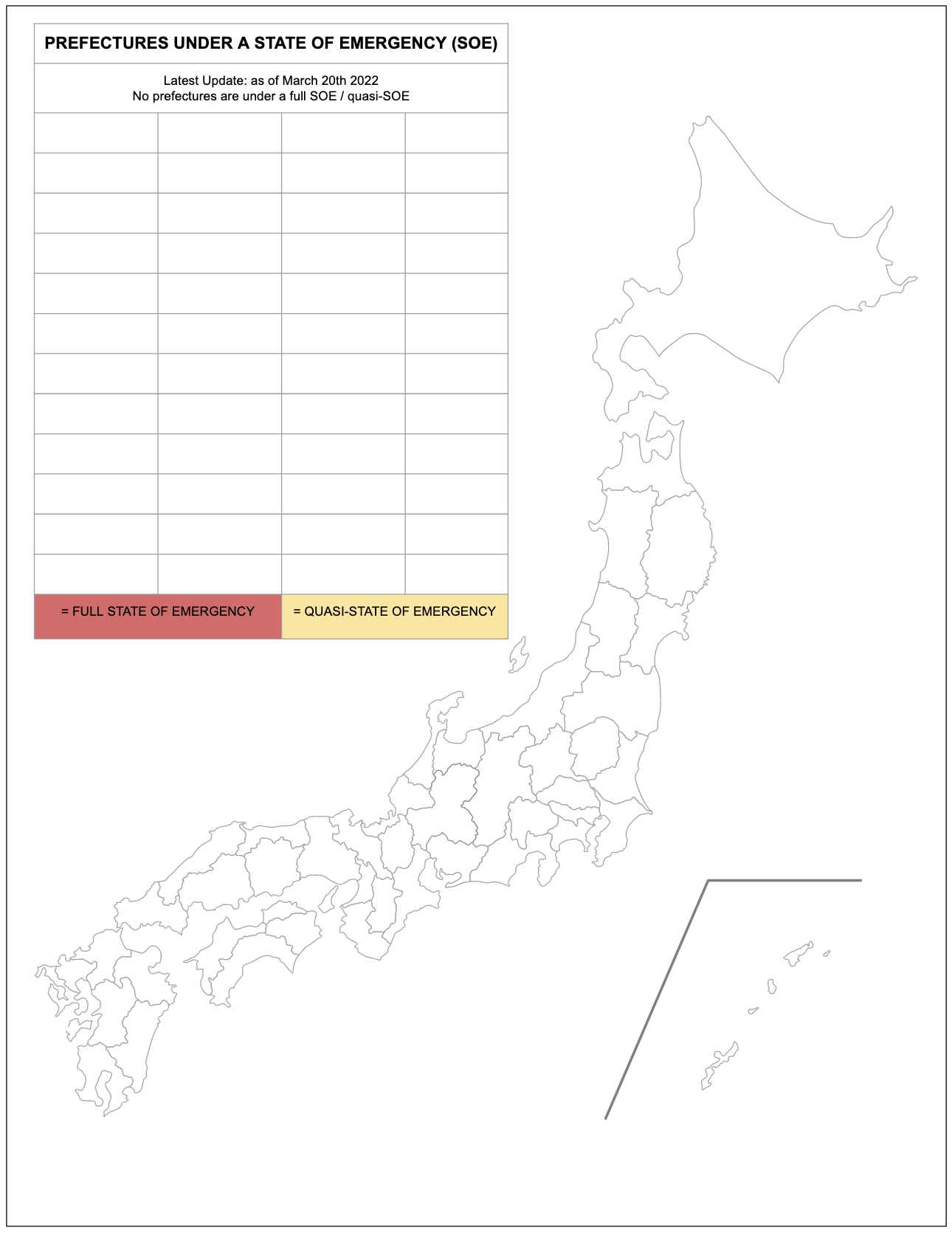 2022年3月6日:適用於13 個都道府縣的「準緊急狀態(SOE)」將於今天(3 月6 日)結束,而18 個都道府縣的緊急狀態已延長至3 月21 日。截至3 月7 日,準SOE 轄下的都道府縣狀態為東京、千葉、神奈川、埼玉、茨城、栃木、群馬、岐阜、靜岡、愛知、京都、石川、大阪、兵庫、香川、熊本、青森、北海道。