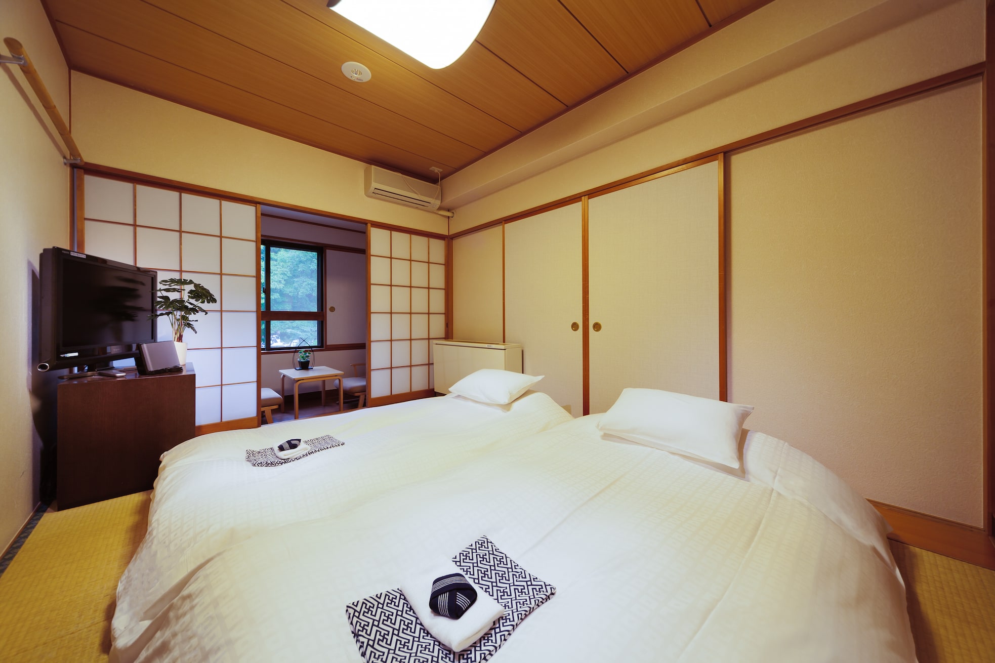 小型的日式雙床房小巧、經濟、舒適,適合單人或情侶入住 房間裡有豪華的 “蒲團 “床墊、”榻榻米 “墊子、推拉式 “莊子 “門、帶Netflix和其他流媒體服務的大型智能電視、Bose音響和小冰箱。 房間內有衛生間和盥洗盆,但沒有私人淋浴或浴缸,客人可以使用酒店寬敞的 “溫泉 “式浴室和蒸汽桑拿。