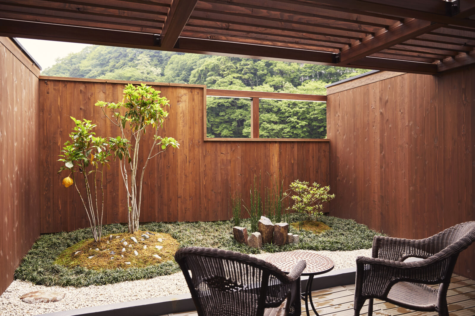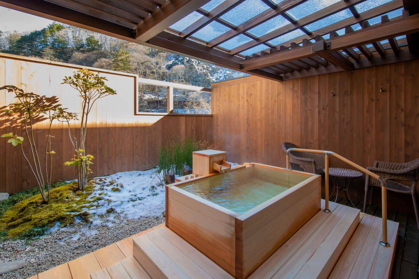 弱酸性、絲滑的泉水因其美容功效而備受推崇,讓您的肌膚倍感光滑、清爽。當您浸泡時,山間溪流的舒緩聲音和周圍高聳的樹木營造出真正身臨其境的動態氛圍。