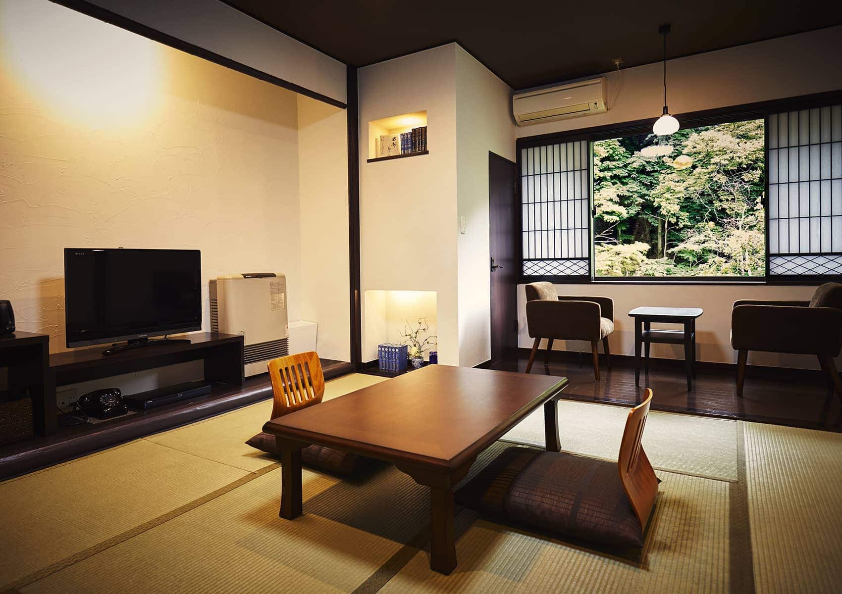 蓼科新湯溫泉飯店的圖書館休息室為房客提供舒適寧靜的放鬆空間。休息室周圍環繞著溫暖的木質內飾和柔和的燈光,提供精選的書籍,從文學到旅行和藝術,讓遊客享受安靜的思考時刻。