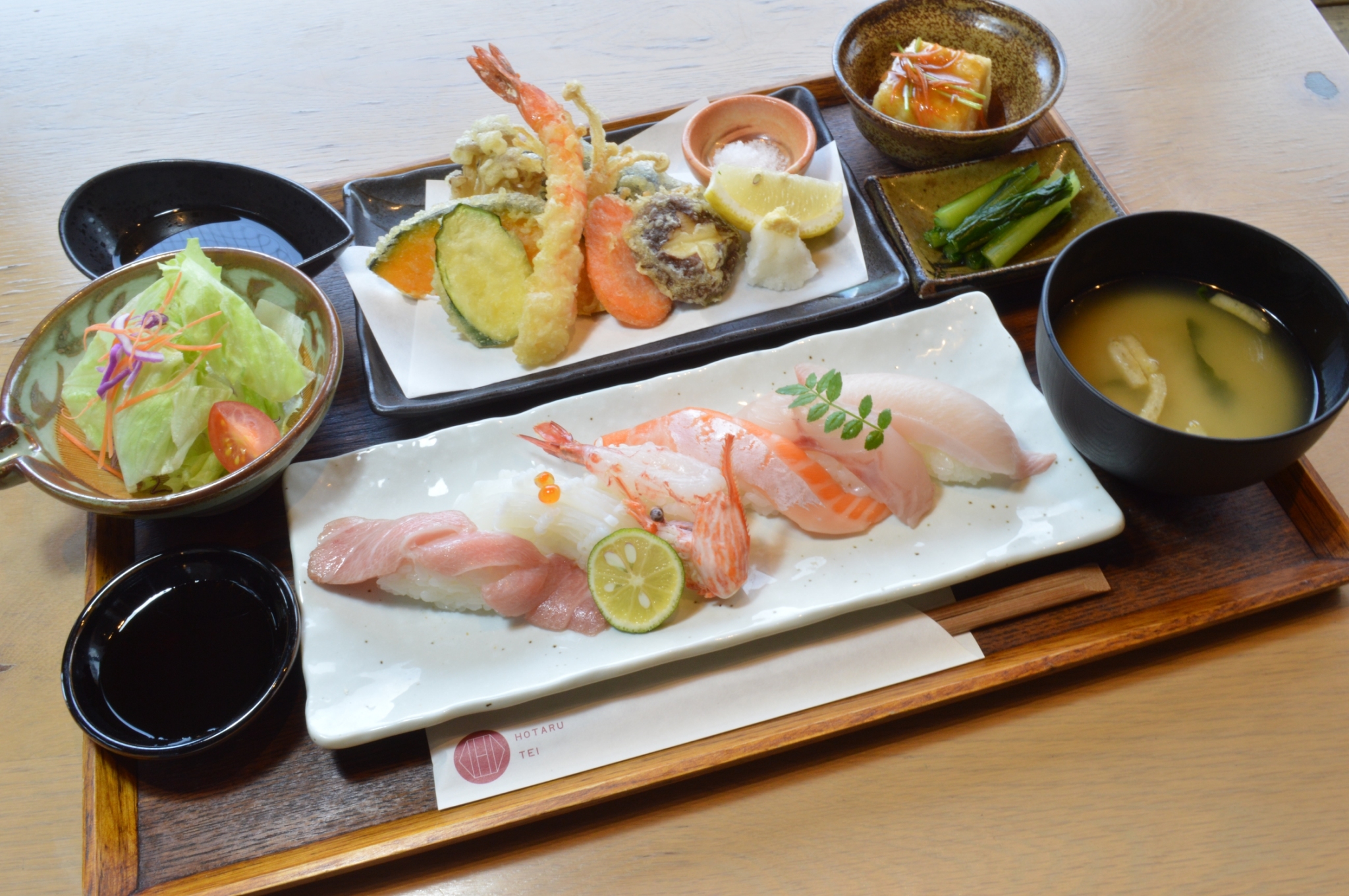上圖是 A 午餐套餐,這是最標準的午餐套餐。套餐包括壽司、天婦羅、溫泉蛋包飯、多種開胃菜等!此外,還提供味噌湯,是寒冷天氣裡的最佳加熱方式。