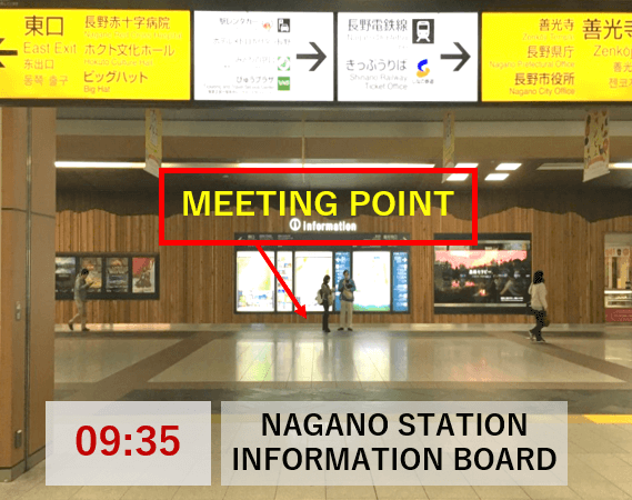 集合點在車站內,新幹線檢票口正對面的信息板前。請務必尋找佩戴SNOW MONKEY RESORTS旅游標籤的導遊,並確保你在集合時間之前到達,因為旅遊需要在09:40之前出發。