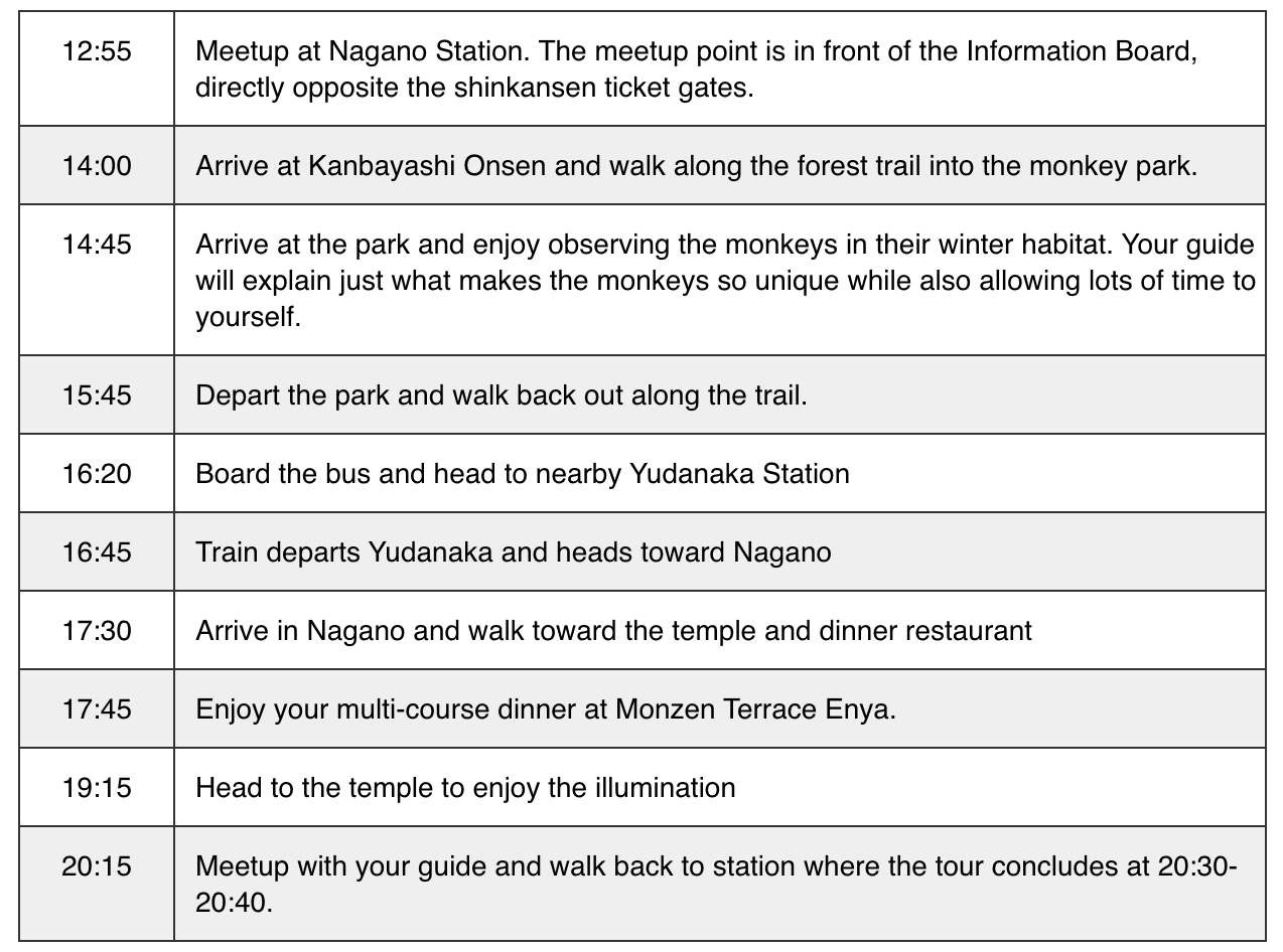 - 旅行的起點和終點是根據新幹線的時間表安排的。在長野站參加本團時,您可以預訂北陸新幹線的以下服務:東京站出發 – 到達長野站東京:07:20 – 長野:08:43 – Kagayaki(僅限預訂座位) 東京:07:24 – 長野:09:14 – Asama 東京:07:52 – 長野:09:30 – Hakutaka** JR長野站是一個小站,我們的早晨集合點就在新幹線/子彈頭列車檢票口的正對面,時間是09:35,因此您可以乘坐07:52-09:30的列車,但請您在到達後直接到集合點.長野站出發 – 到達東京站長野:17:55 – 東京:19:20 – Kagayaki(僅限預訂座位)長野:18:22 – 東京:20:00 – Hakutaka**冬天的時候,我們建議您預訂返回東京的服務。冬天的天氣和道路狀況,我們預計本行程將在17:30之前在JR長野站結束,但我們不能保證。為了安全起見,我們建議您預訂18:22的服務。另外,如果您住在妙高高原,想參加本行程,可以從妙高高原站乘坐電車,準時到達長野站(單程830日元)。從妙高高原站出發 – 到達長野站妙高高原:7:48 – 長野:8:32 妙高高原:8:39 – 長野:9:23從長野站出發 – 到達妙高高原站長野:18:14 – 妙高高原:19:00